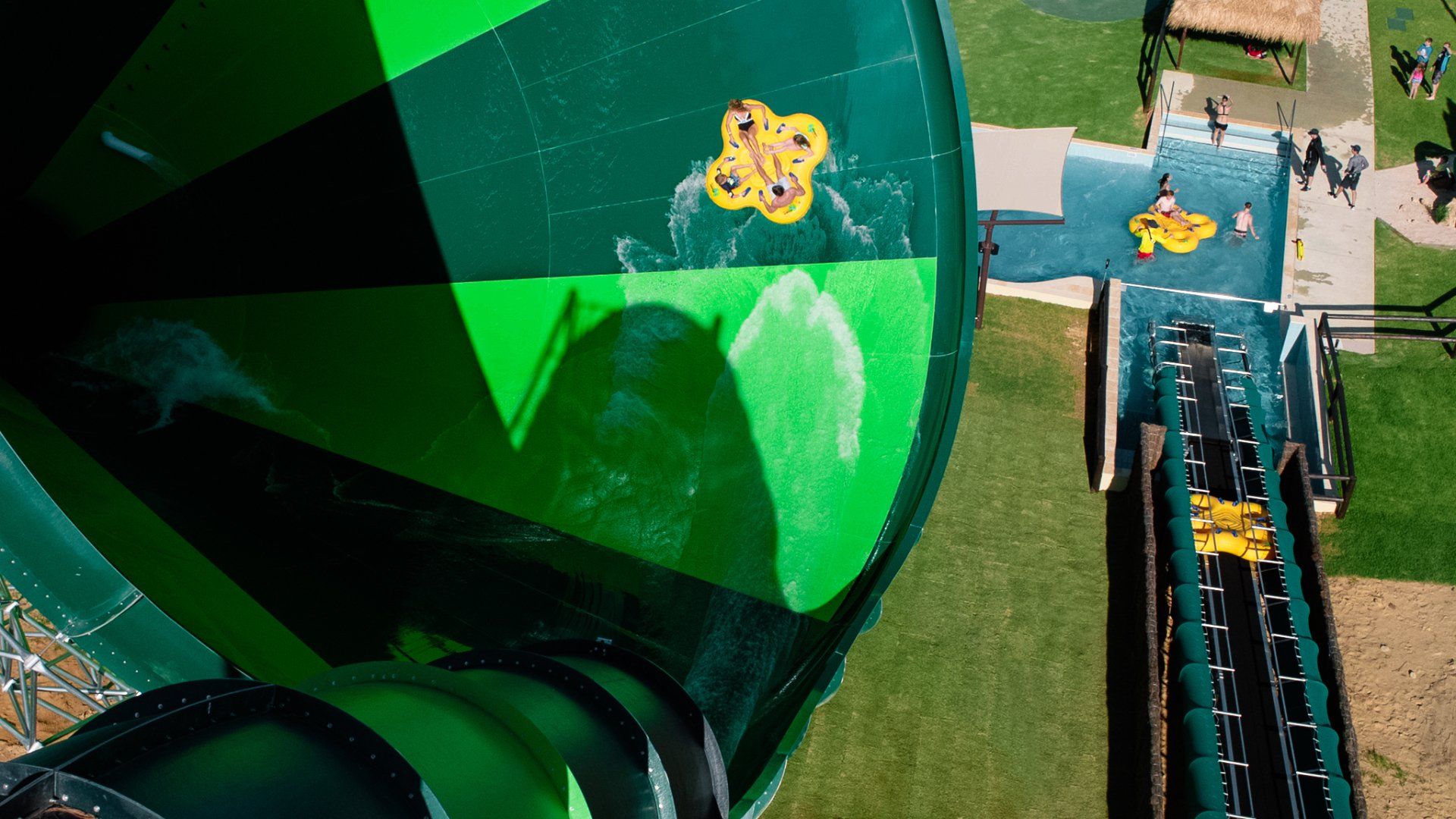 The Kraken is the world’s tallest, steepest and longest funnel waterslide. The waterslide is a uniquely tailored Proslide Tornado 60 design out of Canada and drops 30 metres along 260 metres of spinning and twisting slide. The four-person raft must first negotiate over 150 metres of almost pitch black twists and turns, including a heart-pounding drop and 360 degree twist, before dropping 8 metres almost vertically into the massive 60 foot funnel, which is about the height of a six storey building.